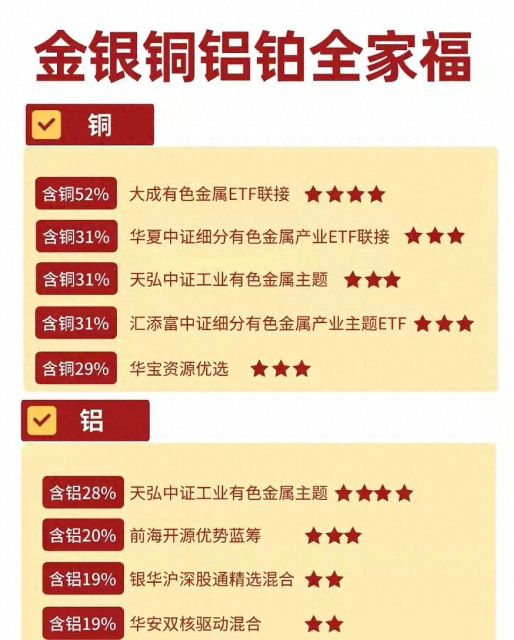• 华宝资源优选:含铜29%,含铝10%,同时持仓一定比例的黄金和稀土,既享受铜铝的周期收益,又能通过贵金属对冲风险;