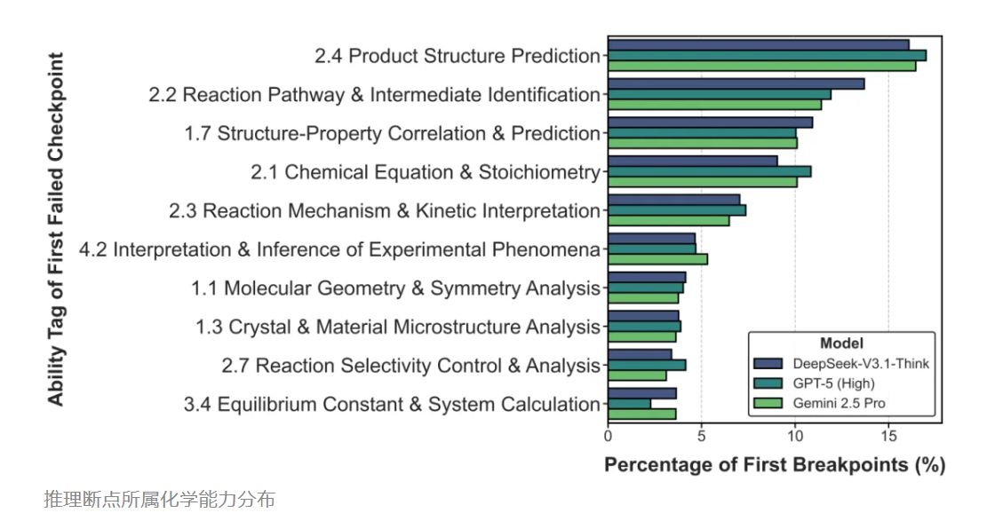 团队发现,AI的推理链条往往断裂于产物结构预测、反应机理识别以及构效关系分析等高阶任务。当前的顶尖模型虽然拥有海量的知识储备,但在处理需要严密逻辑和深刻理解的硬核化学问题时,仍显得力不从心。